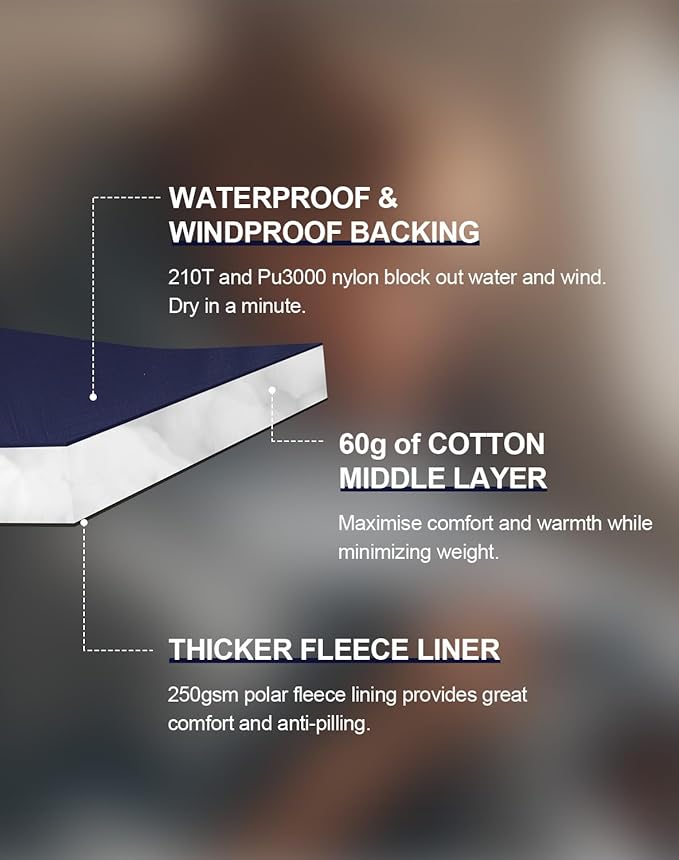 - Thick Warm Fleece - The 250gsm polar fleece lining provides great comfort, combined with 60g of cotton in the middle layer, the warmth is further enhanced. Skin-friendly and cozy, anti-pilling with repeated use and laundering.