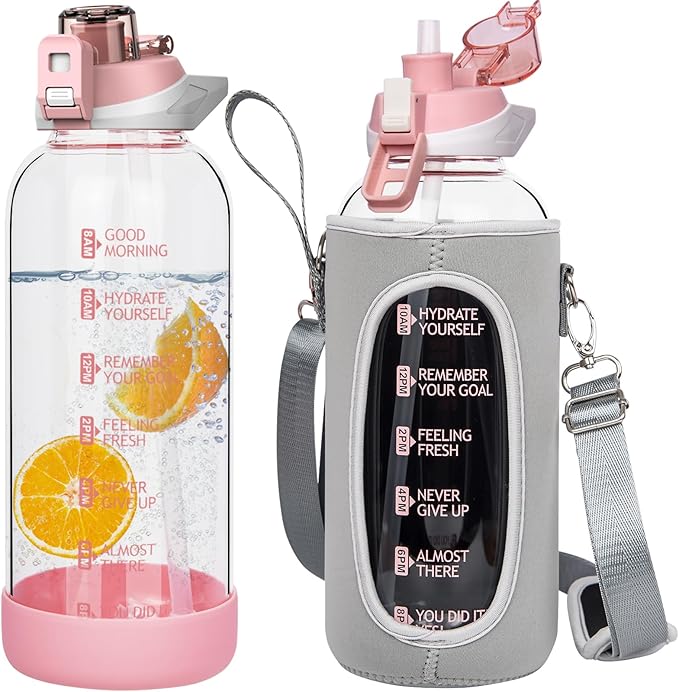 - TIME MARKER & WIDE OPENING - Time markers and motivational quotes on the glass water bottle remind you to drink water and help boost your daily water intake. With wide-mouth design, the drinking bottle is great for fruit infused water, juice, milk, coffee and smoothies.