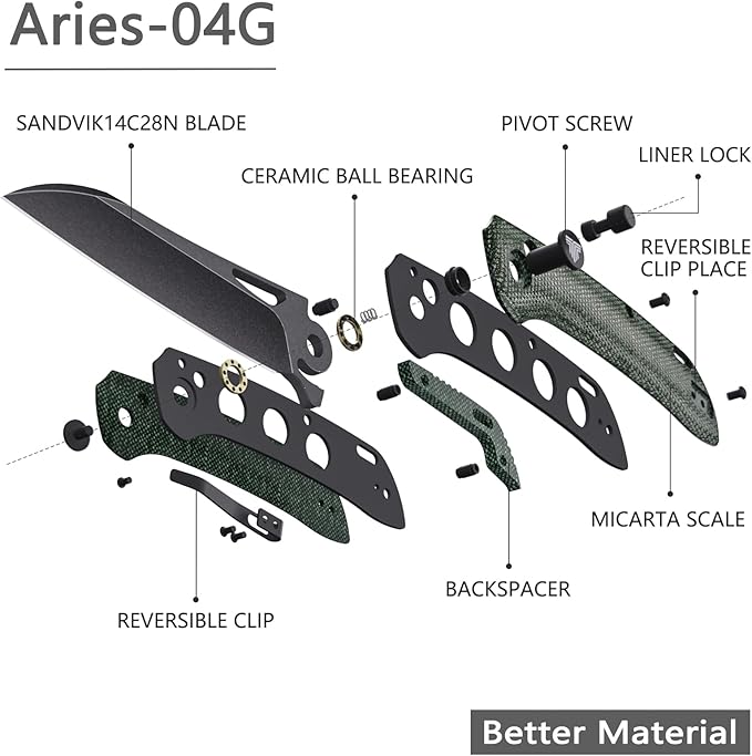 - Handle:Non-slip green micarta scale lightweight handle with reversible deep carry pocket clip.