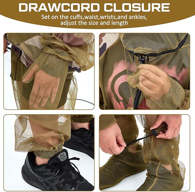 - Zipper Hood and Adjustable Drawstring: our fine mesh full body clothing comes in one size to fit most people, designed with adjustable drawstring to different wrist sizes and ankle sizes, and the hood mask is designed with zipper closure, you can open the zipper closure to enjoy drinks and food without taking off the hood
