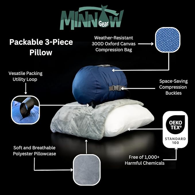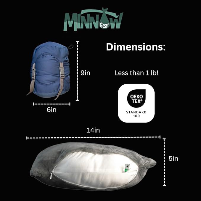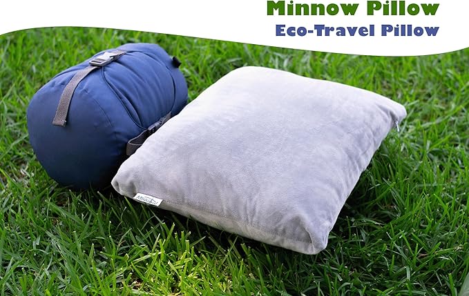 Minnow Pillow Camp and Travel Pillow - Sleep Any Where Any Way - Essential for Car, Camping, Airplanes, and Roadtrips - Not Memory Foam or Inflatable - Eco-Friendly - Oxford Compression Bag