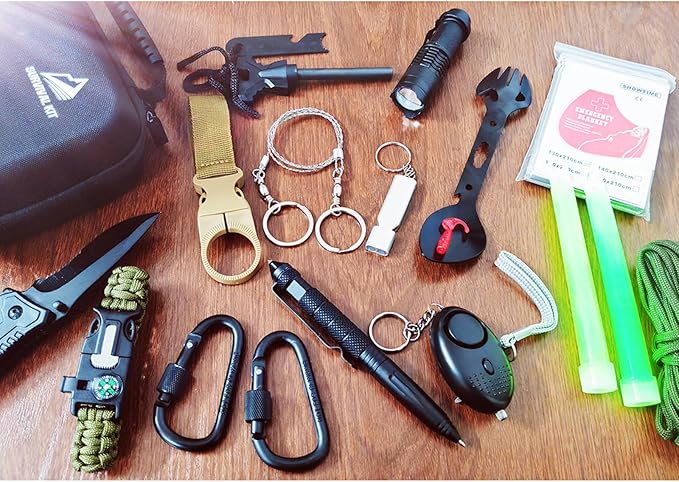 - 【READY-TO-USE & DURABLE】:Not only is this gear easy to carry and lightweight, but it's also comprehensive, No need for professional training, it's simple to use and perfect for impromptu trips: Fire Stone Starter, Tactical Pen, Flashlight, Multifunctional Spoon, Emergency Blanket, Outdoor rope, Light Sticks, Parachute Cord, Survival Bracelet, Ba1t, Waterproof Box...