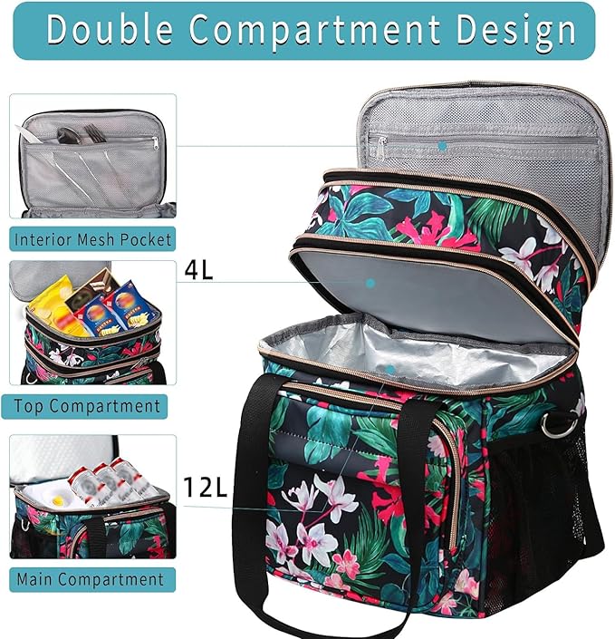 - Large Capacity with Expandable Design: Fits 20 Cans of soda(350ml). Dual Compartments for different uses, the top compartment of the women lunch box is expandable, increasing the capacity by 4L. Normal size with 12L. Handy to use for work, outing, picnic, camping, road trip, and so on
