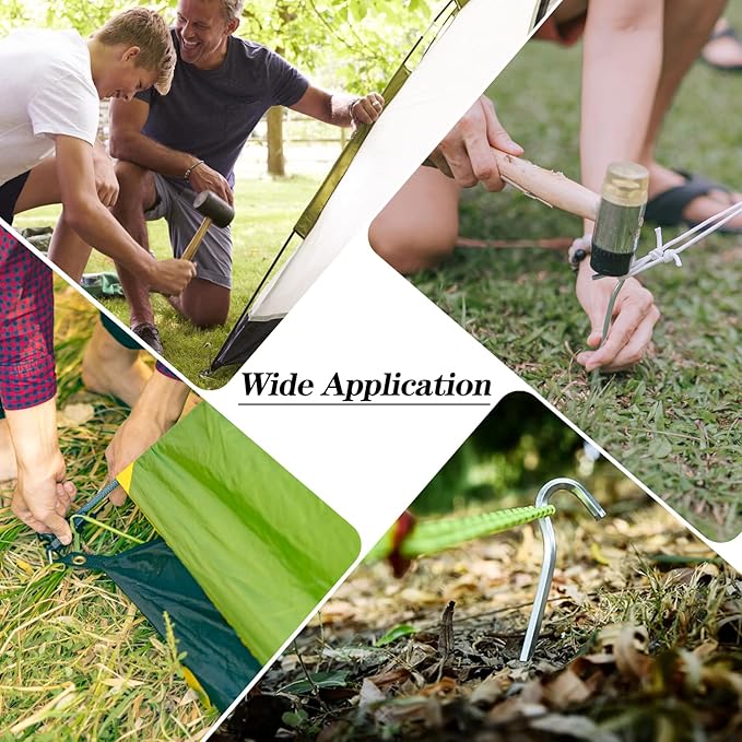 - 【Hexagon Shape】- Tent peg is hexagon rod spike and will not move easily. It has a hook on top. The hook prevents the stake from going too deep and being lost. The overall shape of the tent pegs is a 7-shape, which has a large contact area with the ground and a firmer grip.