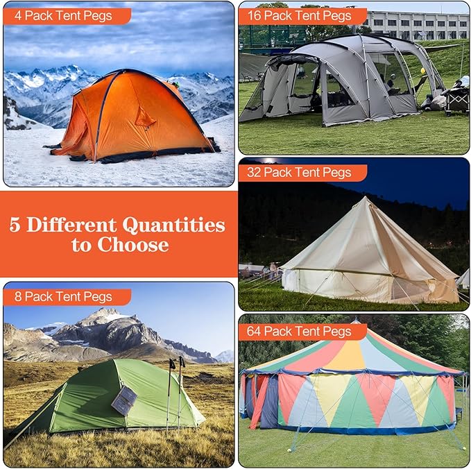 - 【Package Include】- The package contains 64 pack of tent pegs, the length is 7", the diameter is 1/4". It is very easy to use and strong. It is designed for pitching tents on hard or uneven ground. Note: It cannot be used on rocky ground.