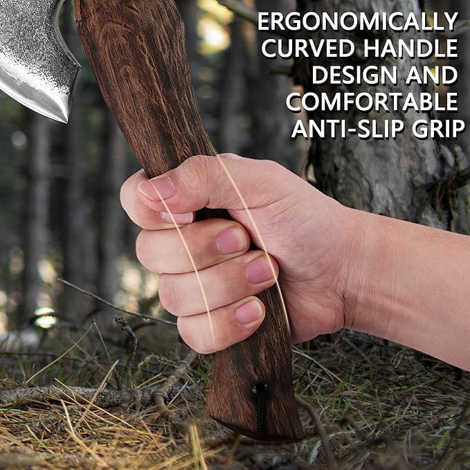- 【Design excellence】Our axe adopts the ideal weight and ergonomic handle design, achieving a perfect balance between weight and size, which helps provide a more natural grip for the hand. The curved handle of the bushcraft axe is more suitable for long-term use as it helpLeather sheath & Sharpenstones reduce fatigue in the forearm and wrist.