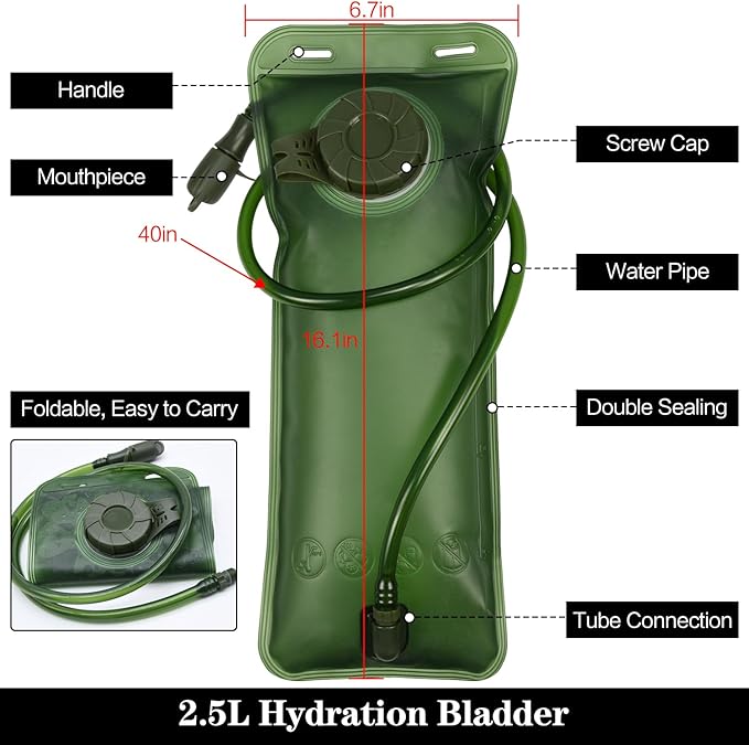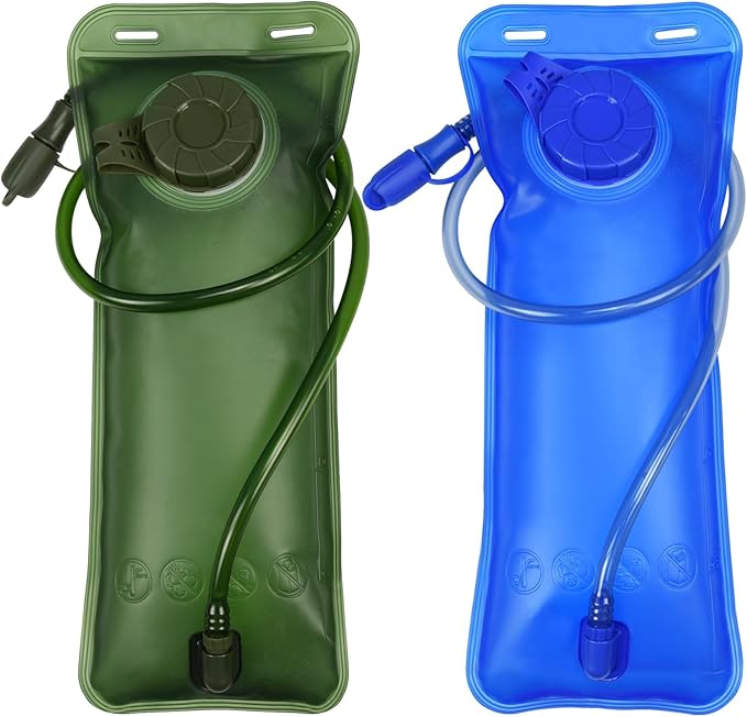 - 【2.5L Hydration Bladders】- You will get 1pcs blue hydration bladder, 1pcs army green hydration bladder and 2pcs suction pipe. 2L water bladder can contain water at -4°F to 122°F. Pipes provide a wholesome flow for easy drinking and keep you hydrated when hiking, climbing or running, etc.