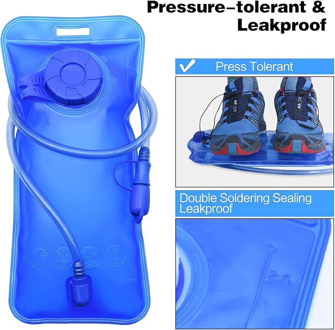 - 【Premium Material】- Hydration bladder is made of double-sided EVA material, it is odorless, tasteless, strong hydrolysis resistance, high strength and high water pressure resistance. The water bladder passed pneumatic pressure test, it is pressure-tolerant.