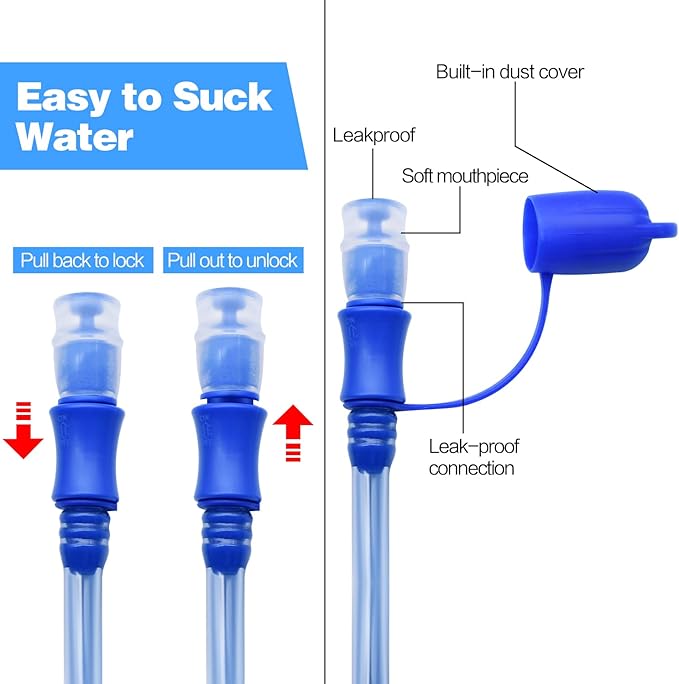 - 【Easy & Quick to Drink】- The hydration bladder is very easy to use. You just need to open the dust cover, pull the valve in the "on" position and bite the soft mouthpiece to drink water easily and quickly without slowing you down. There is a 2in diameter opening screw cap that makes for easy filling water and add ice.