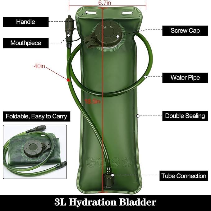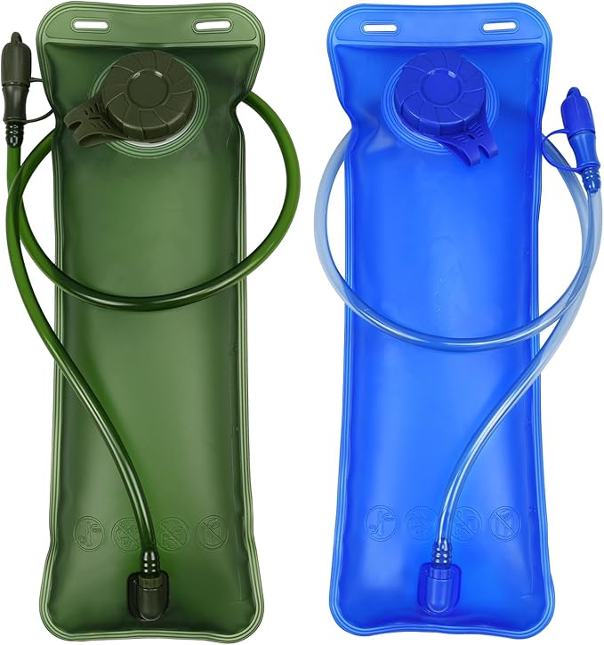 - 【3L Hydration Bladders】- You will get 1pcs blue hydration bladder, 1pcs army green hydration bladder and 2pcs suction pipe. 2.5L water bladder can contain water at -4°F to 122°F. Pipes (4in diameter, 40in length) provide a wholesome flow for easy drinking and keep you hydrated when hiking, climbing or running, etc.