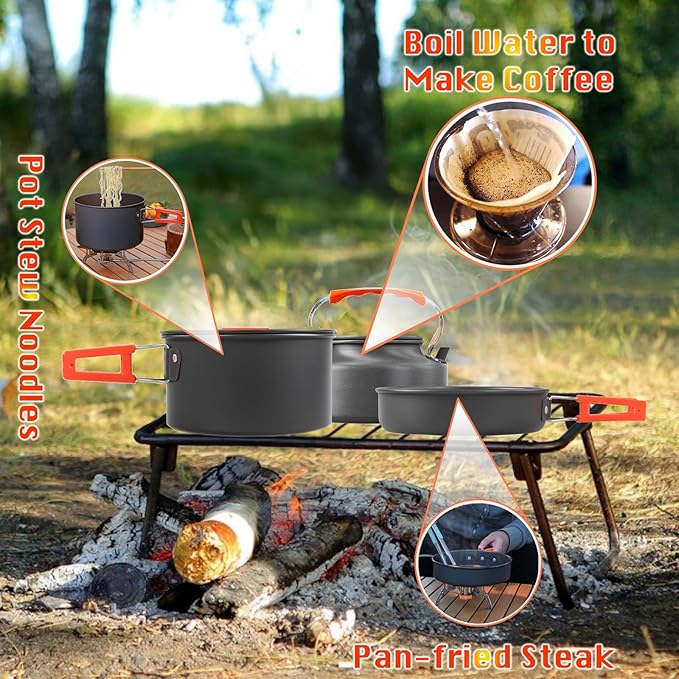- The Best Camping Kitchen Set - Our Camping Cooking Set Is the Ideal Choice for Outdoor Activities. It Includes a Comprehensive Set of Cooking Tools, Such As Pots, Pans, Kettles, Multiple Transparent Bowls, Collapsible Soup Spoons, Rice Spatulas, and Cleaning Sponges. This Set Is Not Only Suitable for Boiling Water and Cooking But Also Perfect for Enjoying Delicious Camping Meals, and Handcrafted Coffee. So It's the Camping Gear Must Haves and Also for Rv Camping Must Haves.