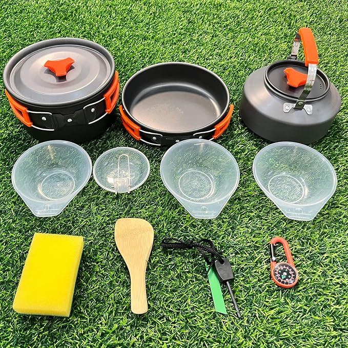 - The Best Money You Ever Spent - the 12pcs Camping Cookware Set Is Perfect for 1-2 People. Package Includes: 1*59.9oz Camping Pot with Lid (6.69*3.54 Inch),1*35.2oz Frying Pan(7*1.77 Inch),1*35.2oz Camping Kettle with Lid,3 Plastic Bowls ,1 Plastic Soup Spoon,1 Banboo Spatula,1 Cleaning Sponge,1x Net Bag for Storage, 1 Flient(3 colors randomly), 1 Mountainerring Buckle Compass(7 colors randomly).
