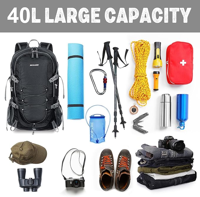 - ROBUST & DURABLE MATERIAL: BECOJADDE 40L hiking bag is constructed with high-quality, water-resistant nylon material, ensuring its durability. It features strong and smooth zippers, built to last.