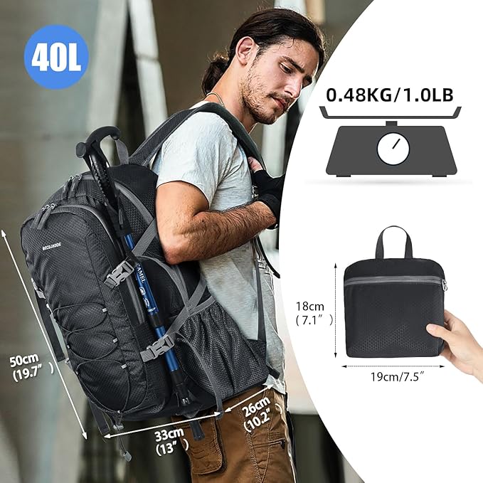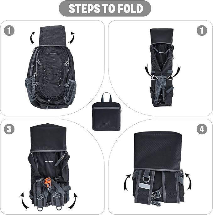 - COMPACT & MULTI-PURPOSE: The compact design of this backpack meets the carry-on standards for most airlines. Whether you enjoy hiking, camping, climbing, cycling, or traveling, this outdoor backpack caters to all your needs. This foldable backpack has versatility and durability, making it an essential travel accessory.