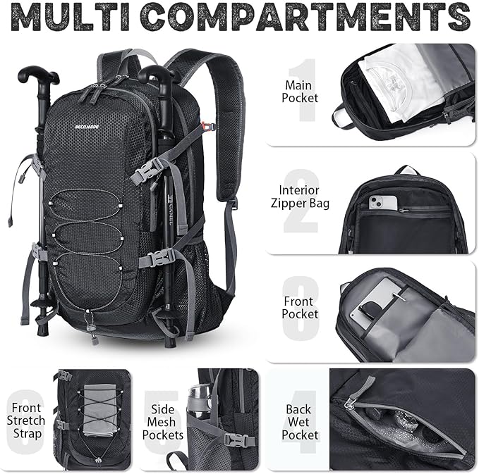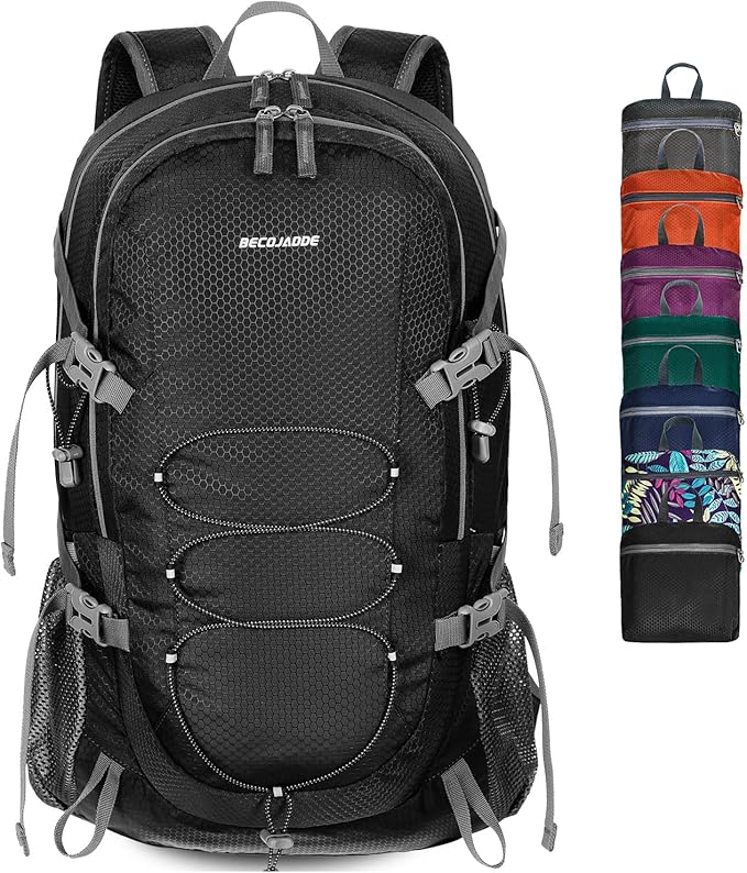 - SPACIOUS & WELL-ORGANIZED: The BECOJADDE packable backpack for travel boasts a sleek, minimalist design with multiple compartments and pockets for optimal organization. This camping backpack includes one main compartment, one wet pocket, one front zippered pocket, two side pockets, and an elastic drawstring. The wet pocket is extremely effective for keeping electronics clean and dry or separating wet clothes from other items.