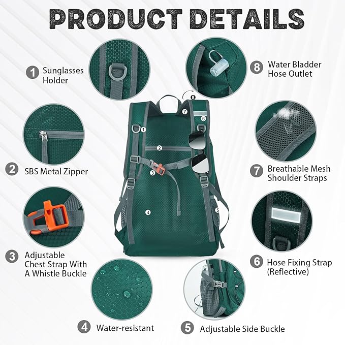 - SAFETY-ORIENTED FEATURES: This outdoor backpack has essential features for emergency situations. It includes a lifesaving whistle, perfect for attracting attention in critical moments. The backpack has a water bladder hole for convenient hydration on the go and multiple reflective strips to improve visibility in low-light conditions.