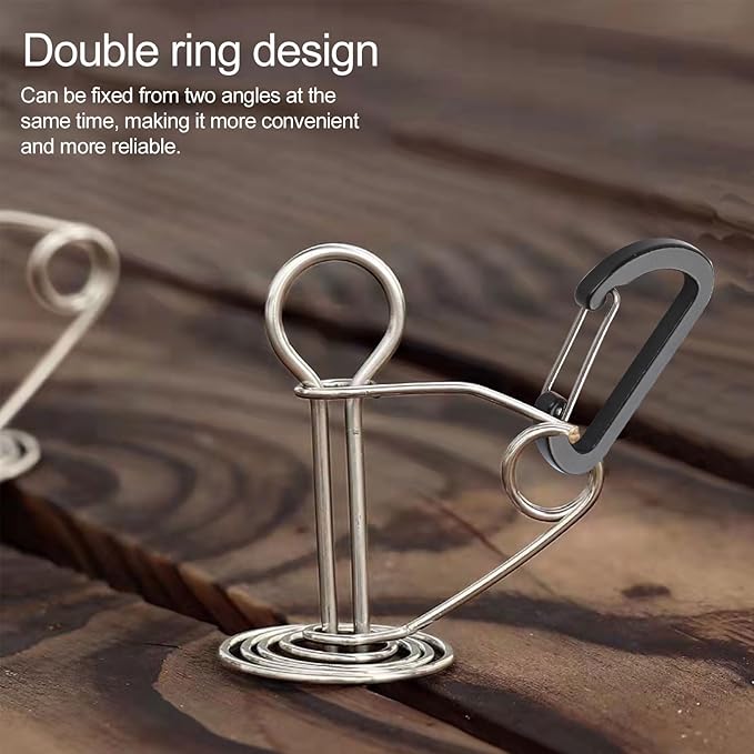 - [Double Ring Design]: These camping pegs are designed with double rings, one ring on the side and one ring on the top, which can meet the needs of multiple angles of connection at the same time, and the shape of the retractable spring at the bottom can adapt to different lengths of tents.