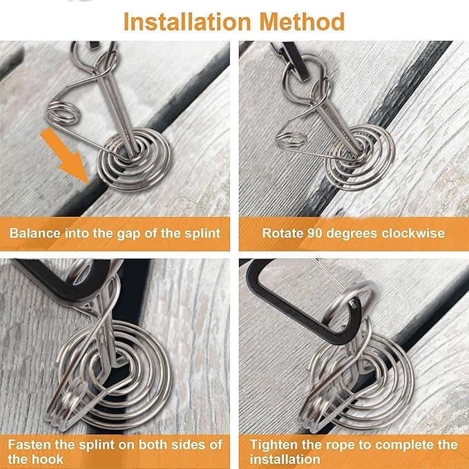 - [Easy Installation] D-shaped carabiner is attached, which is convenient for you to fix the tent on the deck nails. The installation method is very simple. Just insert it into the gap and rotate it to fix it. Binding with D-shaped carabiner and tent rope.