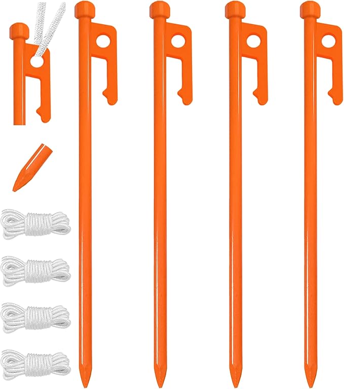 - Versatile Use: Our camping stakes are versatile and ideal for securing tents, awnings, canopies, tarps, and outdoor equipment during camping, hiking, and other outdoor adventures.With a pack of 4 camping stakes , you can use them not only for your tent but also for other purposes such as securing a rainfly, guylines, or even setting up a tarp shelter.