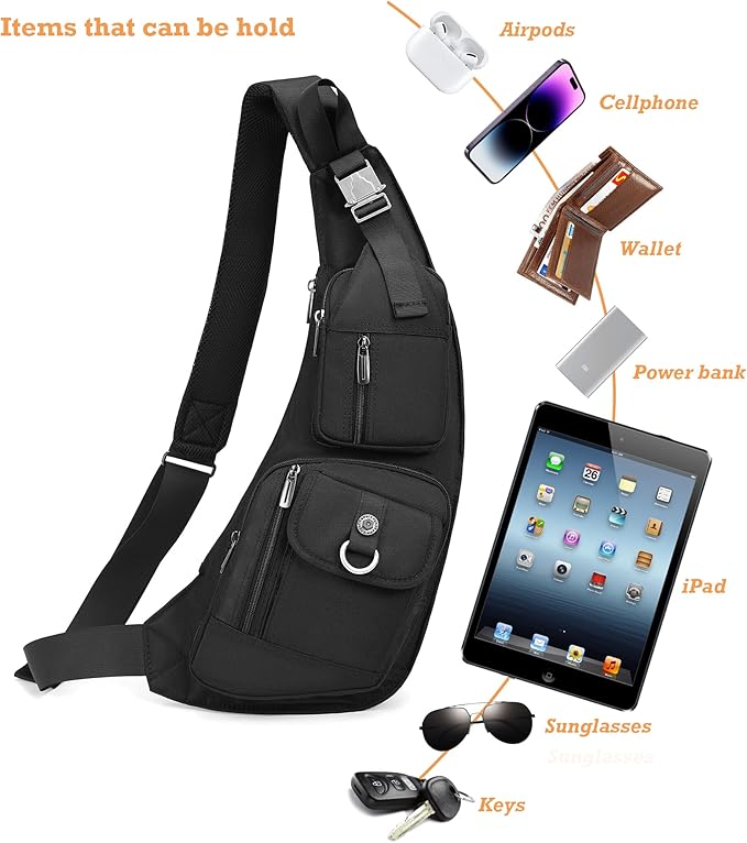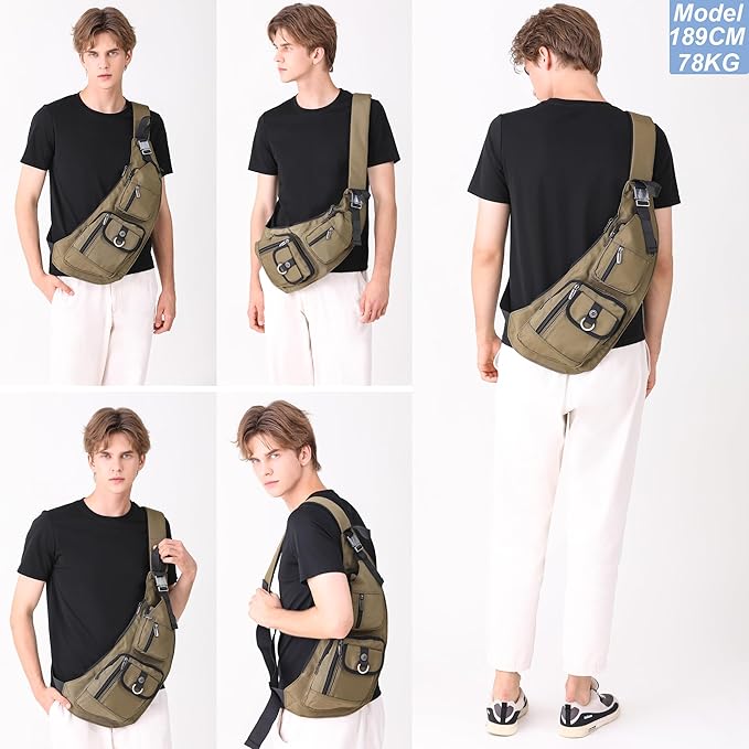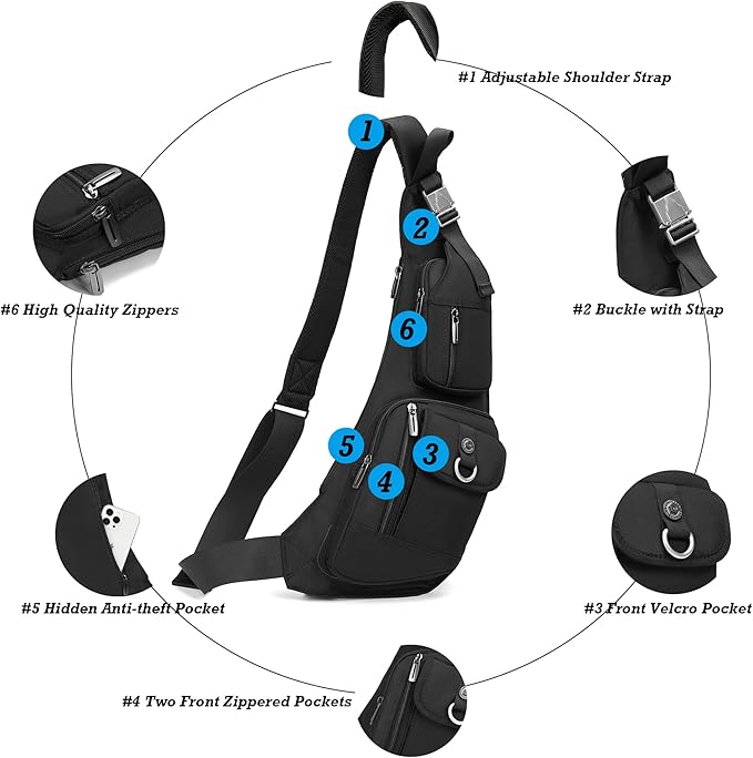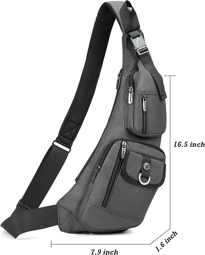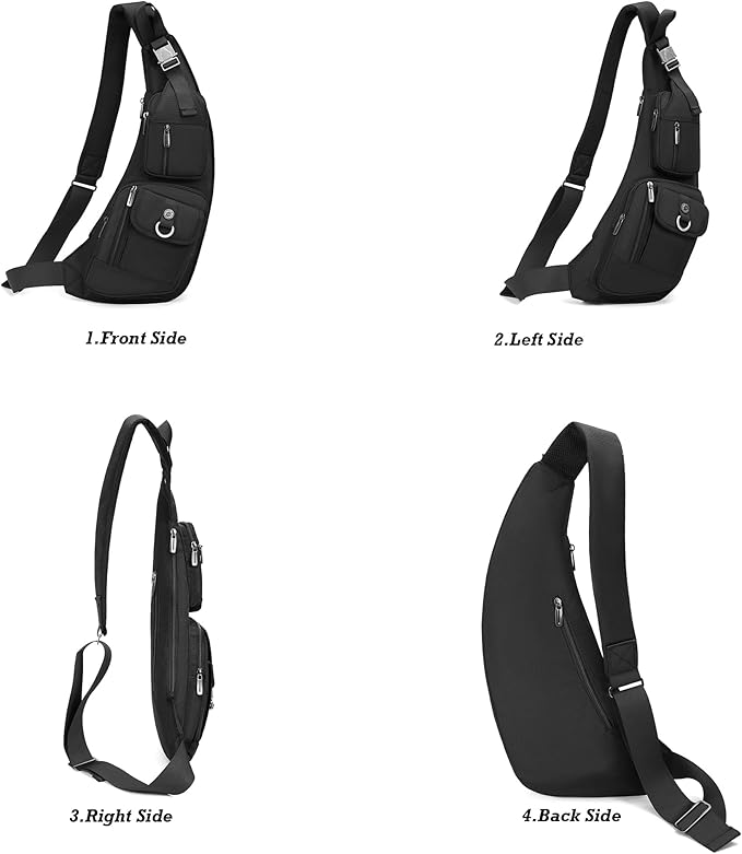 - Material: This sling bag is well constructed of water-resistant nylon material. Lightweight, strong and sturdy. Not easy to be scratched. The size of it is bigger than a fanny pack, but not as big as a backpack.
