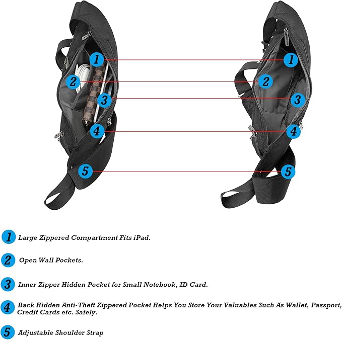 - Multiple Storage: Large main compartment with inner open cellphone pouch and zippered pocket is perfect for 9.7'' Tabelt, Small notebooks, Large cellphone. 4 front zippered pockets are great for various of items. 1 back hidden anti-theft pocket.