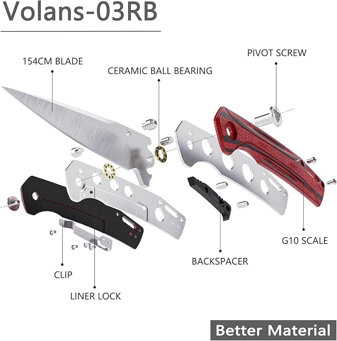 154CM Pocket Knife,3.26in Thumb Stud Satin 154CM Blade,Red and Black G10 Handle with Deep Carry Clip,Folding EDC Knives for Men Camping Fishing,Volans-03RB