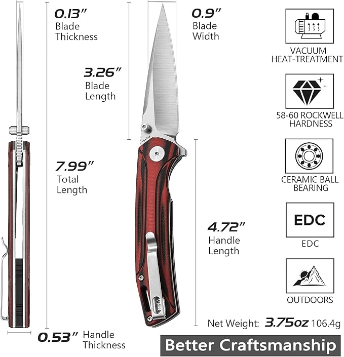 - Handle:Strong G10 scale lightweight handle with deep carry pocket clip.