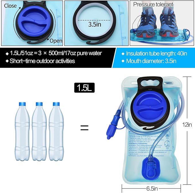 - 【Package Include】- Package includes 1 pack 1.5L blue hydration bladder. It is suitable for short-time outdoor activities and cycling (0-30 miles).