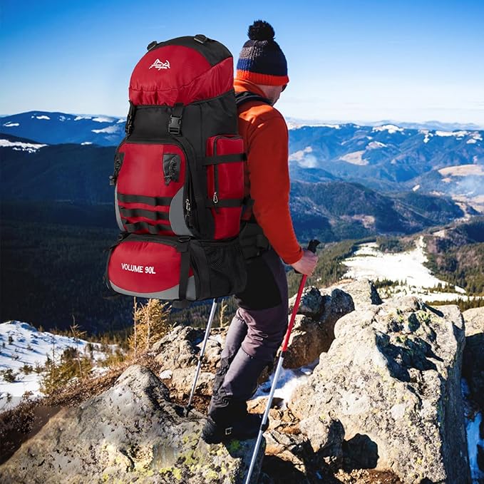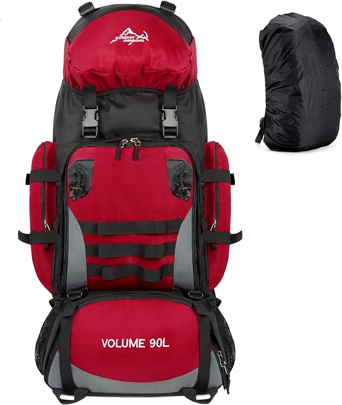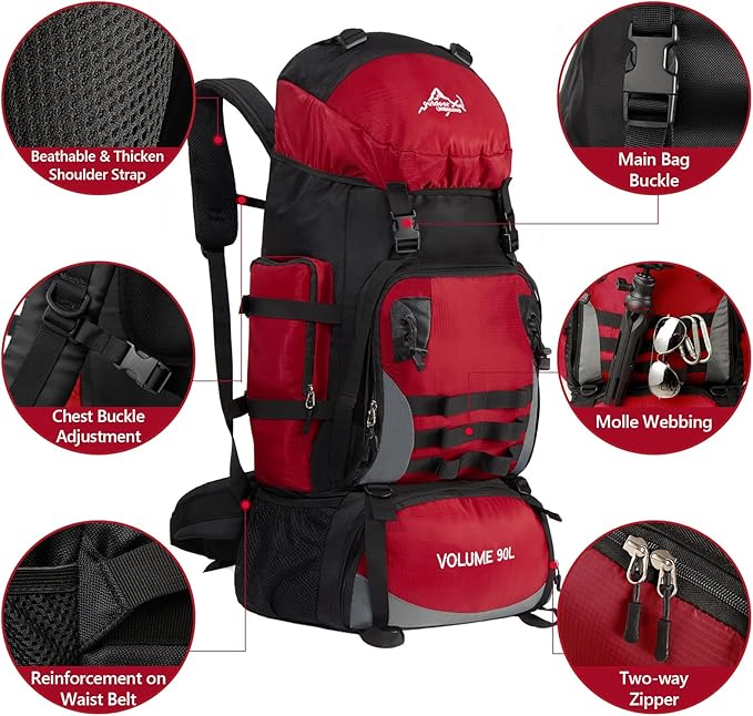 90L Large Camping Hiking Backpack with Rain Cover, Waterproof Molle Rucksack Military Backpack (Red)