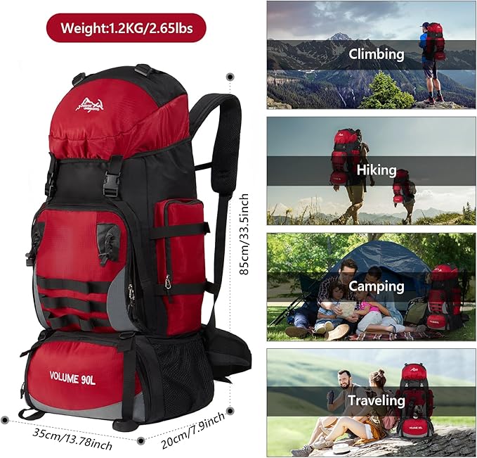 - 【Large Capacity Rucksack】: The 90L Large Capacity Hiking Backpack only 2.65 pounds for easy carrying, adding no burden to your travel. The maximun loading bearing is 45lb. Unfold size: 20*35*85cm/7.9*13.78*33.5in(L*W*H). Perfect size for camping backpack, hiking backpack, trekking backpack, traveling, hunting, fishing.