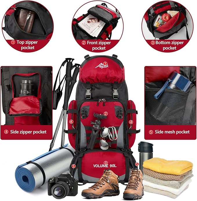 - 【Hiking Backpack Structure】: The 90L camping backpack main compartment is drawstring closed, hiking backpack roomy enough for your storage hiking gear, clothes and luggage, one bottom zipper pocket can store shoes separately from the clothes in the main pocket. Two side mesh pocketes are suitable for placing cups and umbrellas. This mountaineering backpack has one front zipper pocket and two side pocketes for separate and orderly storage.