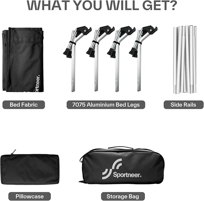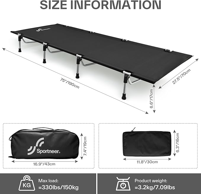 - More Sturdy & Steady: Enjoy the pinnacle of quality and comfort the Sportneer camp folding cot. The portable backpacking cot legs boast exceptional aerospace-grade 7075 aluminum alloy while the lightweight sleeping bed surface is expertly constructed tear-resistant 300D elastic polyester fabric, reinforced PU coating. This winning combination ensures unparalleled stability and durability, supporting a maximum weight of 330 pounds.
