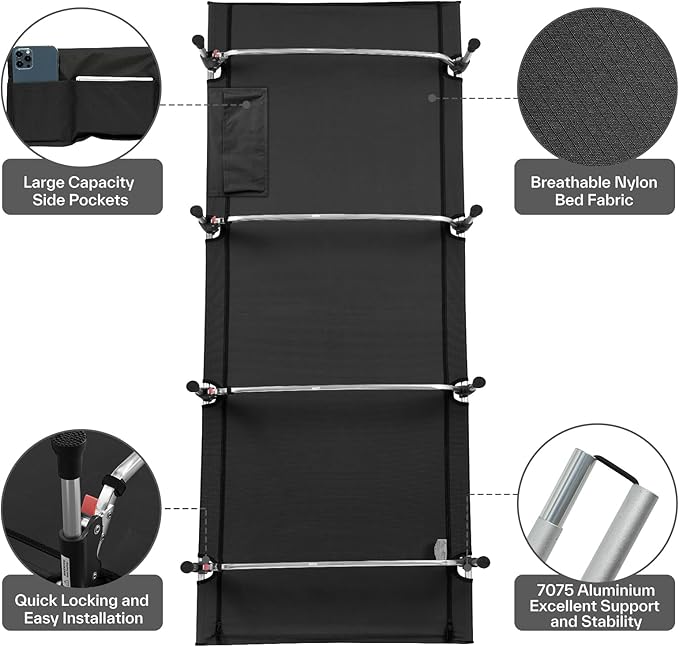 - Effortless Setup & Portability: Our innovative lever locking mechanism allows you to connect the legs and supporting bars, tighten the camping cot surface securely out sagging, and easily disassemble it by pressing the trigger structure. the included storage bag, you can easily pack the camping cots for adults away and hit the road!