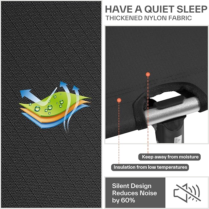 - Silence in Use: Experience a peaceful night's sleep the 74.8x27.6-inch Sportneer camping cot. Its inner mesh fabric backpacking bed surface reduces noises caused by turning over, ensuring a quiet and comfortable slumber. the ample space and whisper-quiet design, you can rest easy wherever your adventures take you.