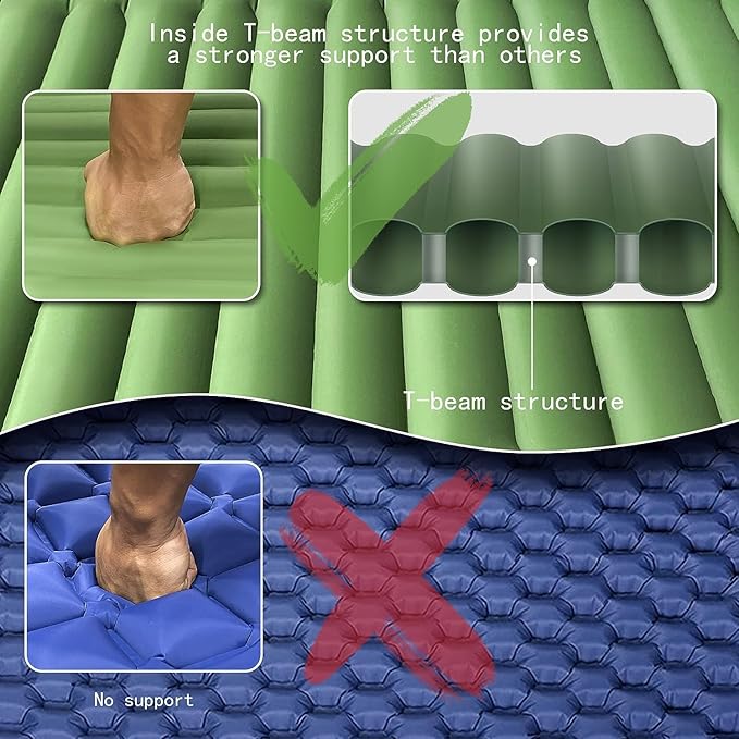 - [Innovative Support Tech] - The improved T-beam structure inside the sleeping pad makes the camping air mattress can withstand much more pressure and more supportive than other normal ones. This Innovative inner structure can distribute the pressure evenly, keep you body away from the ground, ensuring your body balance and superior comfort for you have good sleep all night, whether on your back or your side sleeping.
