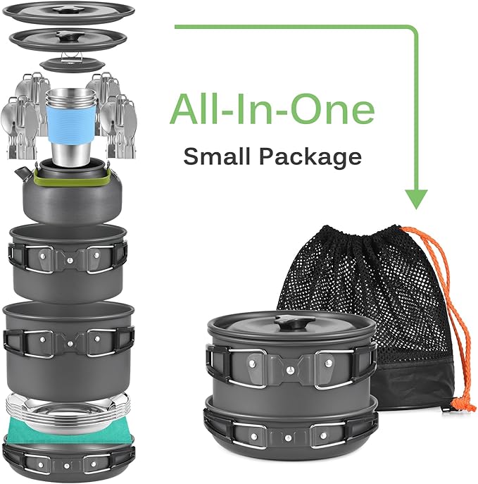 - 【HIGH QUALITY COOKWARE MESS KIT 】 All pots and frying pans are made of high-grade hard aluminum oxide, which is resistant to high temperature and wear, and is very suitable for outdoor cooking.Coated with a non-stick for easier use and clean up. The dinner cutleries are made from 304 stainless steel which is completely safe to use.The cleaning cloth is safe to use on the coated surface and allows you fast and easy clean-up after you're done.