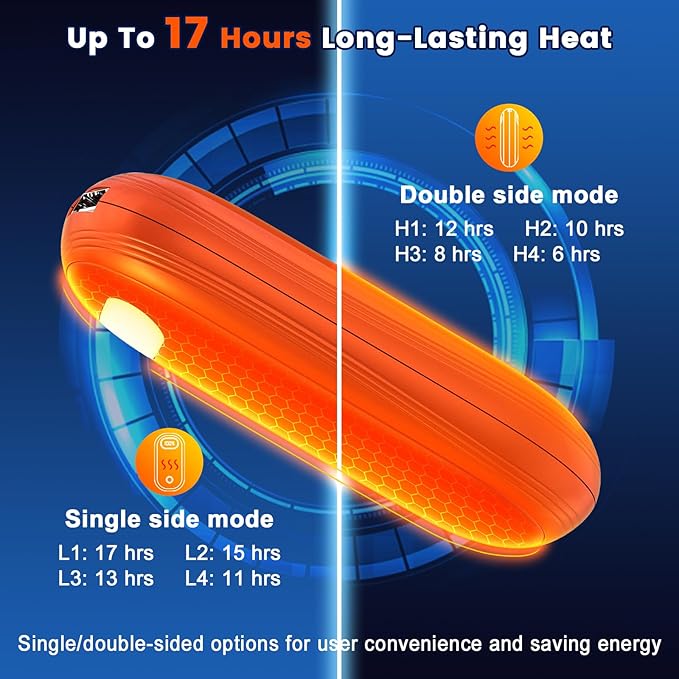 - 【 Experience Prolonged Warmth! 】Our reusable hand warmer delivers rapid 2s heating. After a 3-4 hrs charge, it provides up to 17 hours of continuous warmth! Opt for dual-side heating (H1/H2/H3/H4) to enjoy 6 to 12 hours of all-around warmth. If you prefer single-side heating (L1/L2/L3/L4), you'll have 11 to 17 hours of warmth.