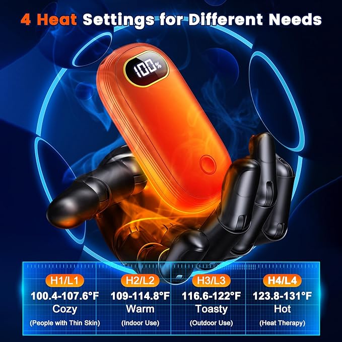 - 【Adjustable Heat Settings & Modes】4 heat levels (100-108℉/109-115℉/116-122℉/123-131℉), single/double side heating options, providing a total of 8 heating modes, whether you need a gentle warmth for everyday use or a high heat blast to combat freezing conditions, just 2s fast heating, our electric hand warmers have you covered.