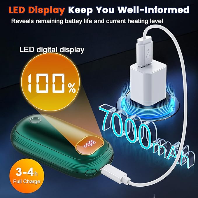 - Multi-functional Handwarmers: Our 7000mAh rechargeable hand warmers also double as a handy power bank, you can charge your devices on the go. It also comes with a built-in flashlight to provide a reliable illumination source, digital LED display to check the current heat level and the remaining power, say goodbye to battery anxiety