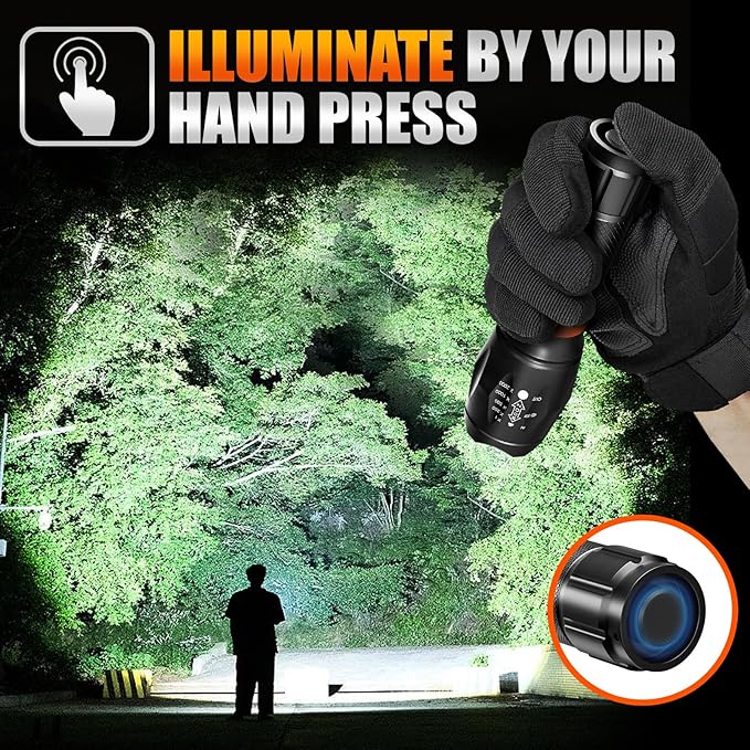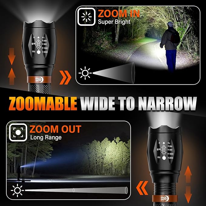 - MULTIPLE LIGHTING MODES and ZOOMABLE BEAM: These flash lights easily switch between 5 modes (High, Medium, Low, Strobe, SOS) for various tasks, all controlled by hand press. Zoom in for precision or broaden the beam for wide-area coverage