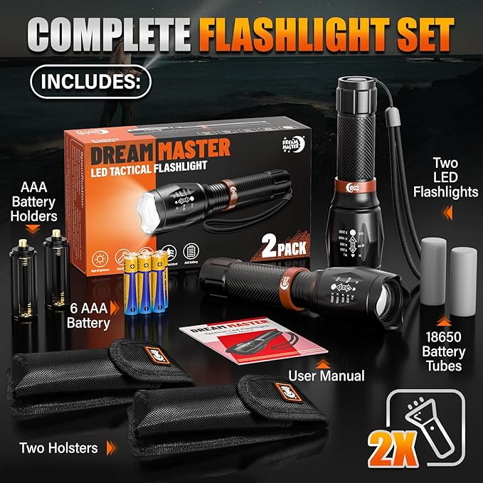 - GIFTS FOR MEN: This versatile flashlight package includes 2 LED Tactical Flashlights, 6 AAA Batteries, 2 AAA Battery Holders, 2 Battery Tubes, 2 Hand Straps, 2 Holder Cases (Bonus Accessory) and 1 Operation Guide. These make for a perfect stocking stuffers gift. Be prepared for any situation with a reliable, compact, and high-quality lighting solution that suits everyone's needs. Great idea as a Christmas Valentine's Day, Father's Day, Halloween or Thanksgiving gift