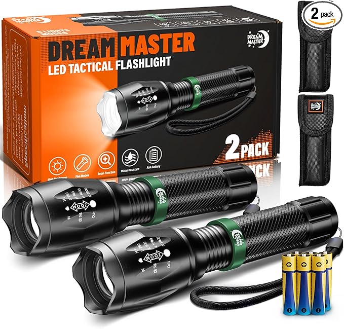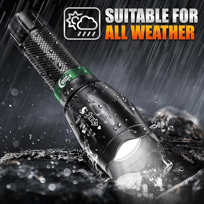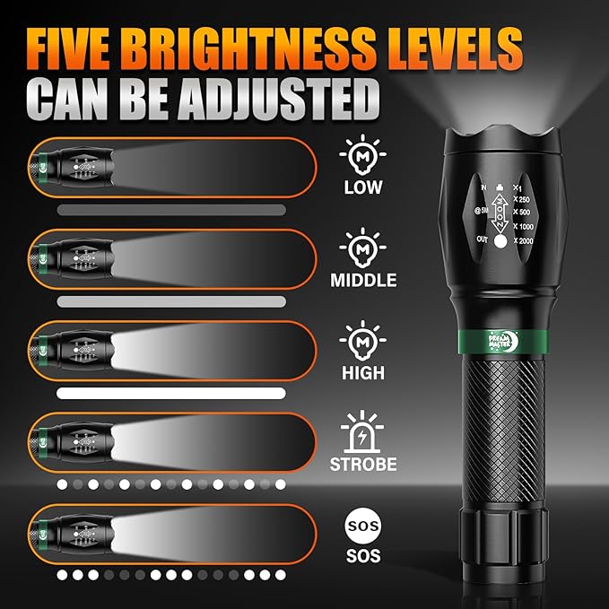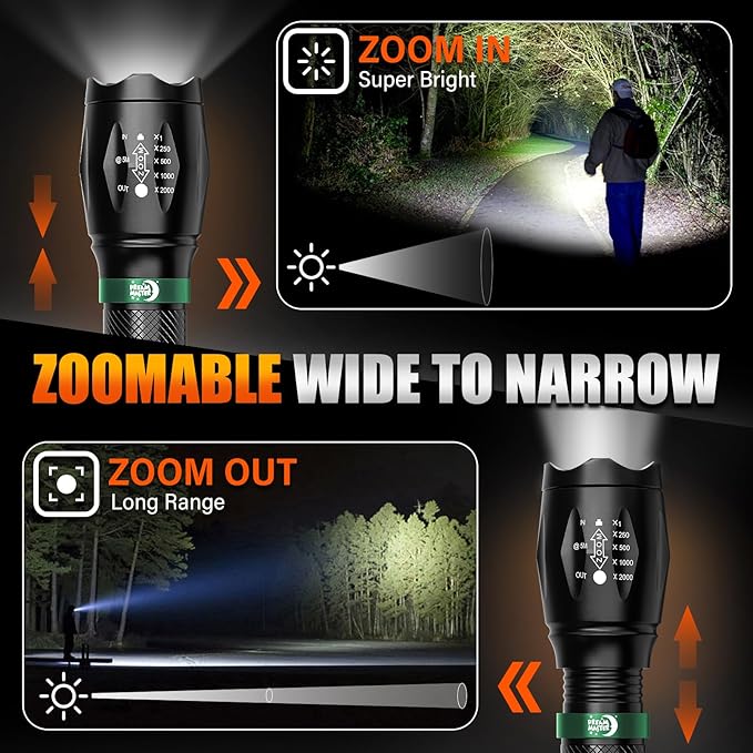 - MULTIPLE LIGHTING MODES & ZOOMABLE BEAM: These flash lights easily switch between 5 modes (High, Medium, Low, Strobe, SOS) for various tasks, all controlled by hand press. Zoom in for precision or broaden the beam for wide-area coverage