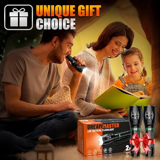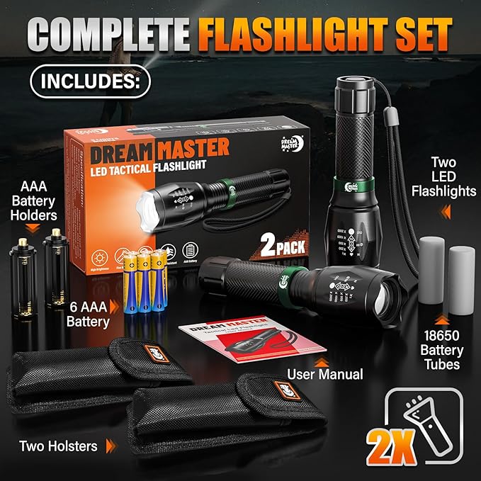 - STOCKING STUFFERS FOR MEN: This versatile flashlight package includes 2 LED Tactical Flashlights, 6 AAA Batteries, 2 AAA Battery Holders, 2 Battery Tubes, 2 Hand Straps, 2 Holder Cases (Bonus Accessory) and 1 Operation Guide. These make for a perfect stocking stuffers gift. Be prepared for any situation with a reliable, compact, and high-quality lighting solution that suits everyone's needs. Great idea as a Christmas Valentine's Day, Father's Day, Halloween or Thanksgiving gift