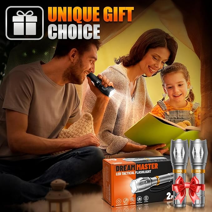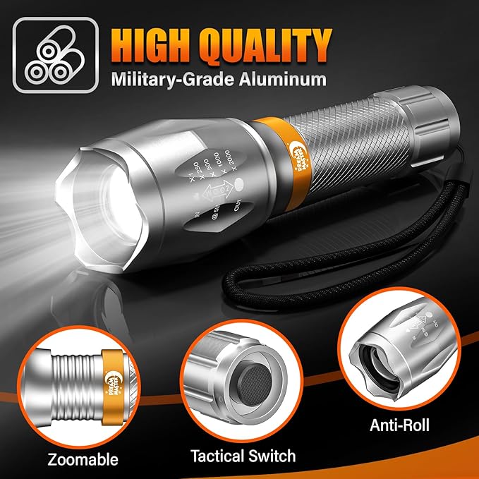 2 Pack LED Flashlights High Lumens with 6 AAA Batteries, 5 Modes Mini Waterproof Tactical Flashlight for Camping Hiking, Bright Flashlight with Zoomable, Fathers Day Dad Gifts for Men, Silver & Orange