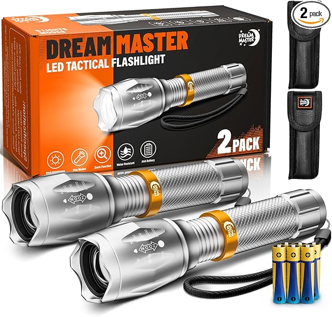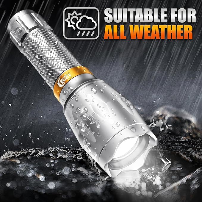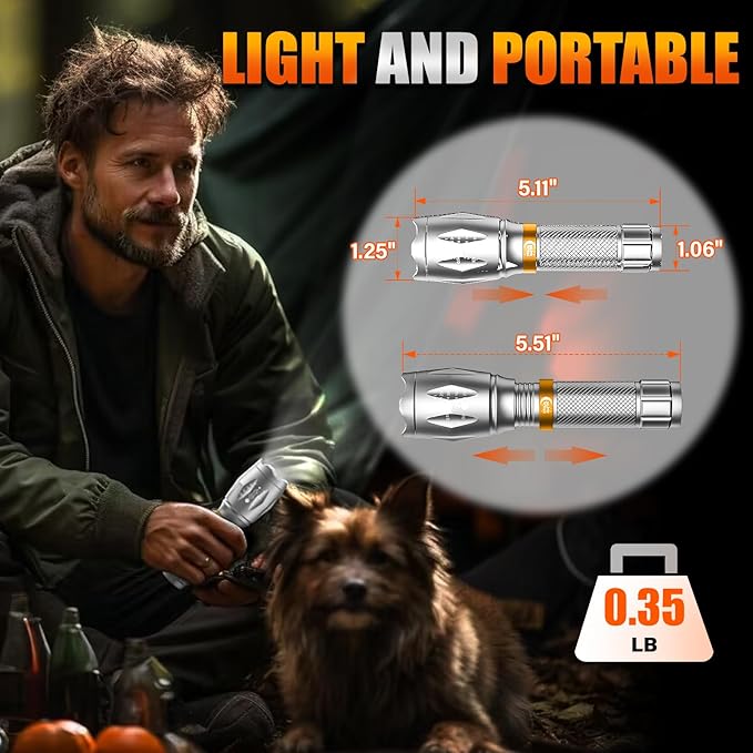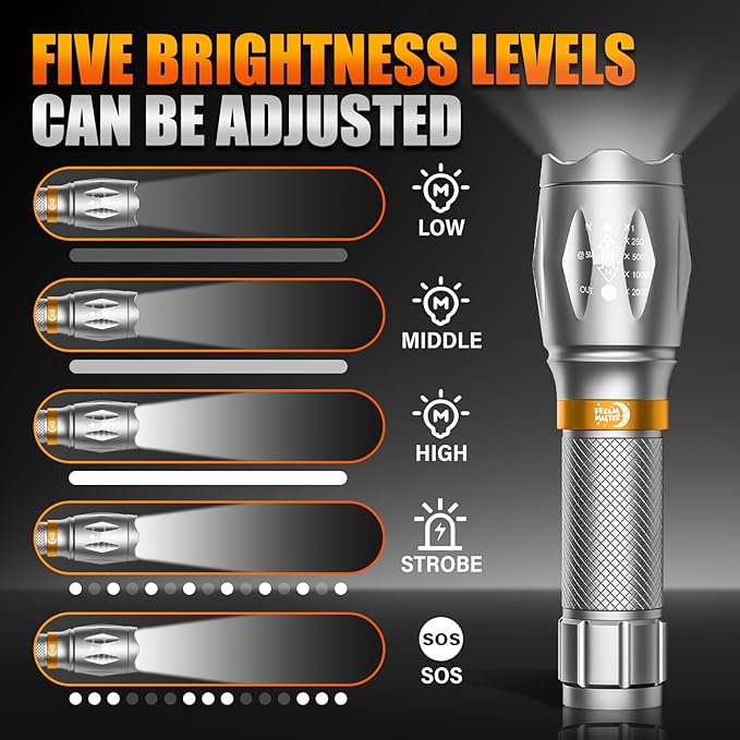 - MULTIPLE LIGHTING MODES & ZOOMABLE BEAM: These flash lights easily switch between 5 modes (High, Medium, Low, Strobe, SOS) for various tasks, all controlled by hand press. Zoom in for precision or broaden the beam for wide-area coverage