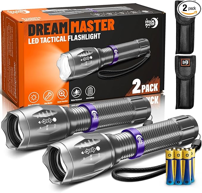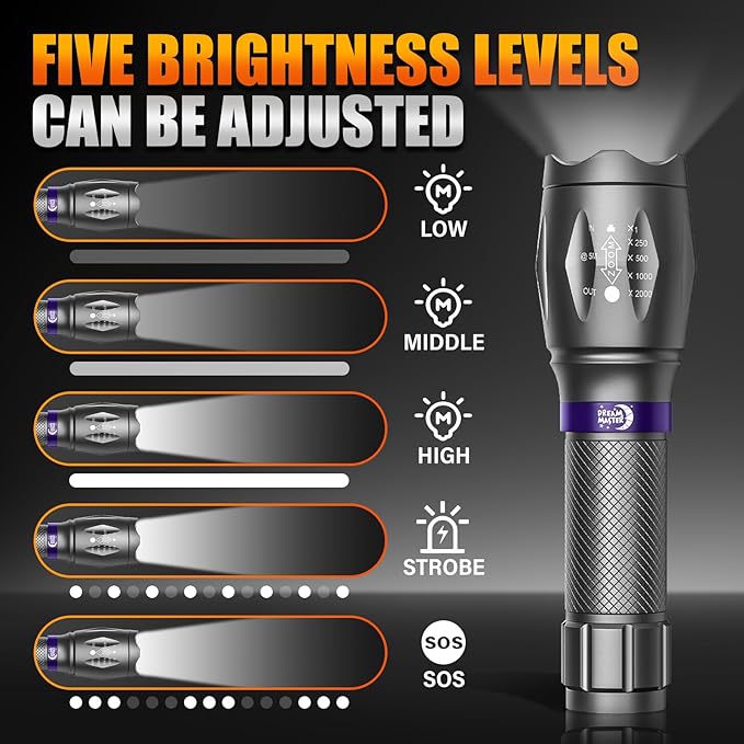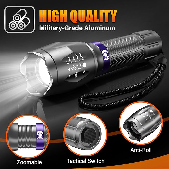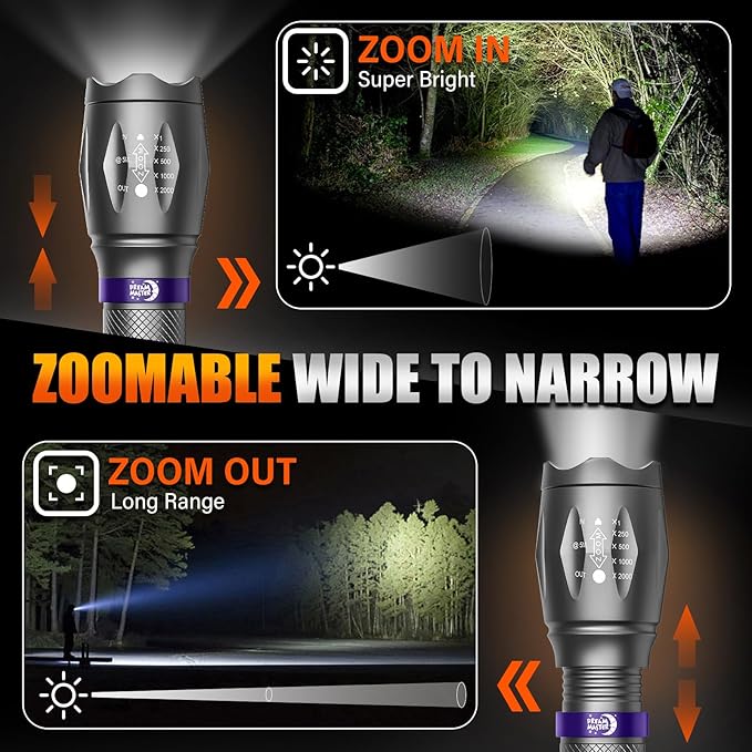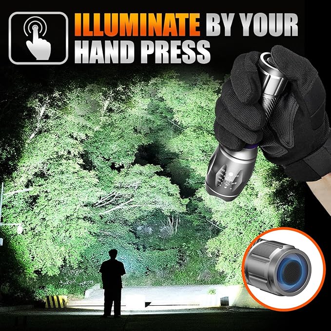 - MULTIPLE LIGHTING MODES & ZOOMABLE BEAM: These flash lights easily switch between 5 modes (High, Medium, Low, Strobe, SOS) for various tasks, all controlled by hand press. Zoom in for precision or broaden the beam for wide-area coverage