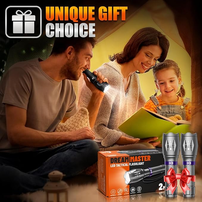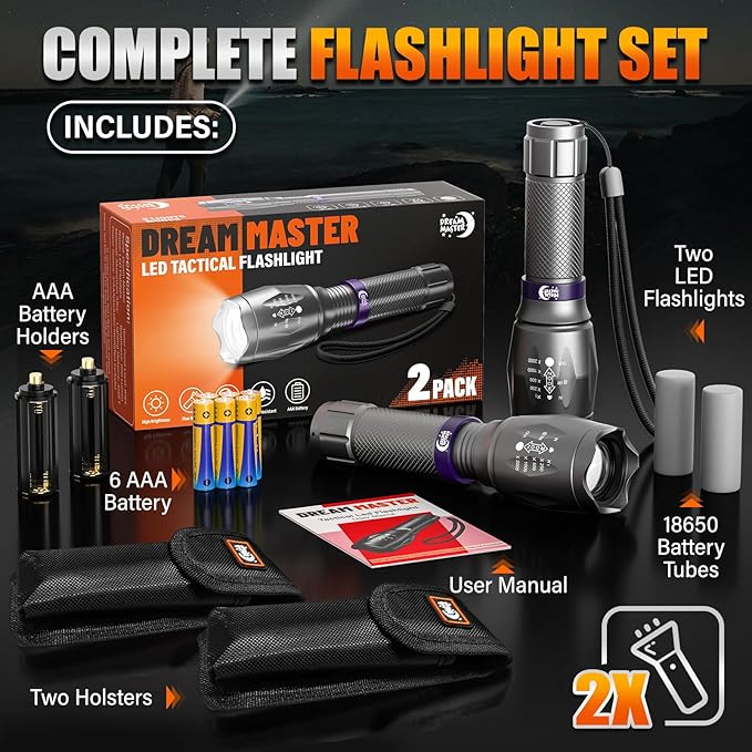 - GIFTS FOR MEN: This versatile flashlight package includes 2 LED Tactical Flashlights, 6 AAA Batteries, 2 AAA Battery Holders, 2 Battery Tubes, 2 Hand Straps, 2 Holder Cases (Bonus Accessory) and 1 Operation Guide. These make for a perfect stocking stuffers gift. Be prepared for any situation with a reliable, compact, and high-quality lighting solution that suits everyone's needs. Great idea as a Christmas Valentine's Day, Father's Day, Halloween or Thanksgiving gift