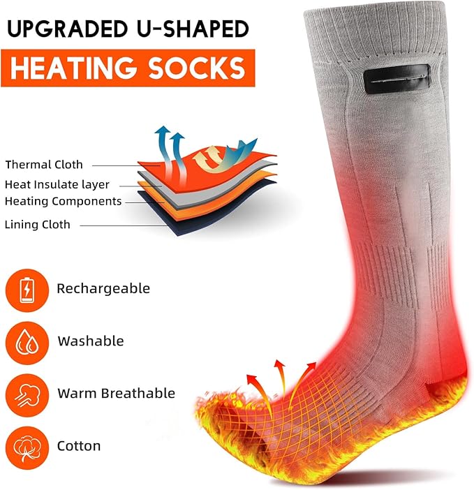 - 【U-Shaped Heating Socks】2023 Upgraded heated socks use ring-shaped heating to make your feet heated evenly, and you can feel the temperature in 30 seconds, stimulating blood circulation and making your feet feel warmer. Rechargeable heated socks are great for bad circulation, chronically cold feet, and stiff joints