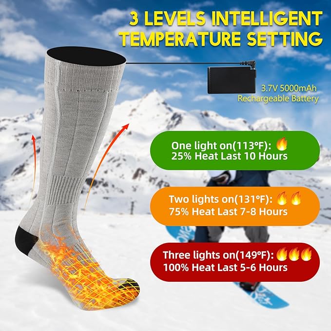 - 【3 Heat Settings To Keep Warm】Heated socks for men and women have three intelligent heat settings that allow you to adjust to a comfortable temperature. High: 149℉ lasting 5-6 hours; Medium: 131℉ lasting 7-8 hours; Low: 113℉ lasting 10 hours. Electric heated socks can keep your feet warm all day long. Please charge batteries fully before first use