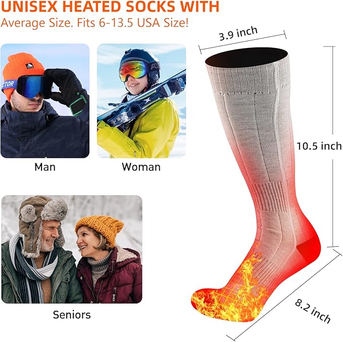 - 【Soft and Breathable Heated Socks】The heated ski socks are washable, and accept cleaning with machine wash (in washing bag). The soft and breathable materials make heated Sox absorbent, breathable, quick-drying, elastic thickened. Unisex Heated Socks with Average Size. Fits 6-13.5 USA Size